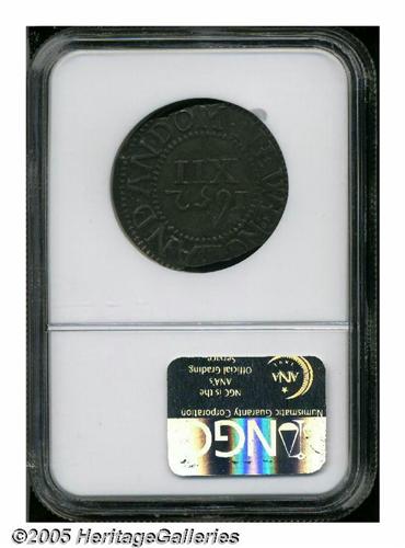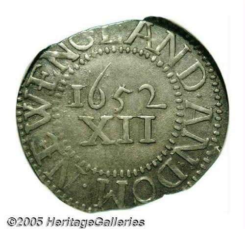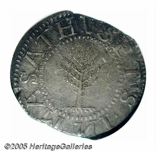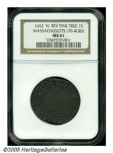 <B>1652<SHILNG> Pine Tree Shilling, Large Planchet MS61 NGC.</B></I> 70.4 grains. Noe-2, Crosby 4-F, R.5. The "Straight Branches" variety (labeled by NGC as the 'N' Reversed variety, which is not totally incorrect since the N below the tree is indeed reversed) is also included under the No Pellets type. The obverse displays a stiff, upward-pointing tree, unlike any other Pine Tree Shilling die pairing. Like many of its kind, this piece exhibits multiple planchet clips, but these do not obliterate an appreciable amount of the peripheral lettering. The surfaces are a pleasing, natural gunmetal-gray and just a hint of waviness is seen in the flan. Listed on page 24 of the 2005 <I>Guide Book.</B></I>