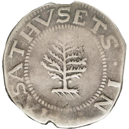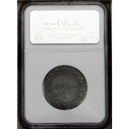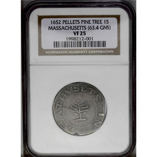 <B>1652 SHILNG Pine Tree Shilling, Large Planchet VF25 NGC.</B></I> Noe-1, Crosby 12-I, R.2. 63.4 grains. A smooth and gently wavy dove-gray piece with pleasing detail for the designated grade. Out of round due to a mint-made clip along the right border, and edge flaws at 12 and 6 o'clock. Noe-1 survivors appear to be evenly divided into two die states: early without breaks, and late dies with reverse breaks, most notably between the 16 in the date. The present piece is from late dies. Listed on page 37 of the 2007 <I>Guide Book.</B></I><BR><BR><b>Shipping:</b> Coin/Currency (<a target="_blank" href="http://www.heritageauctions.com/common/shipping.php">view shipping information</a>)