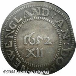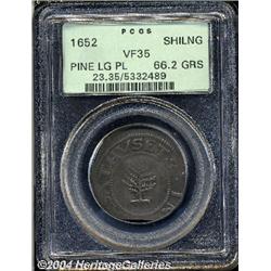 <B>1652<SHILNG> Pine Tree Shilling, Large Planchet VF35 PCGS.</B></I> Noe-1, Crosby 12-I, R.2. 66.2 grains. A smooth dove-gray representative that has crisp details despite even wear. The edges have several straight clips, these are as issued by the Boston Mint to conform with weight standards although most examples of Noe-1 are between 71 and 74 grains. One edge clip affects the M in MASATHVSETS, however, the upper obverse has an unusually large area of unclipped selvage. A later die state with breaks between the 16 in the date and near 3 o'clock on the reverse. Pine Tree Shillings are an important addition to any collection of Early American coinage, as they were a mainstay of east coast currency for nearly a century. <BR><BR><B>Important notice:</B> Heritage usually auctions material at the rate of 200-250 lots per hour. On some occasions eBay Live bid software or the Internet may not be able to keep up with the pace of the auction. We recommend placing a realistic absentee bid now as insurance to avoid disappointment. Occasionally the auctioneer may eliminate or reject an eBay Live bid, and the auctioneer may also reopen a lot after the close of the eBay live bidding (usually because we missed an audience bid), and may reject your bid even if it shows you as the winning bidder. By bidding via eBay Live, you agree that Heritage may award the lot to another bidder at its sole discretion under the circumstances described above or any other reasonable circumstances. Since eBay bids are not shown to us until we open the lot on the floor, we treat those bids just like floor bids. In most cases the floor responds before the eBay bid is presented to us, due to Internet lag time, so for consistency we have made it a policy that floor bids are always considered first over tie eBay live bids. Also please note that all Heritage lots purchased through eBay Live carry a 20% Buyer's Premium. Please make sure you read the Terms and Conditions before you bid.