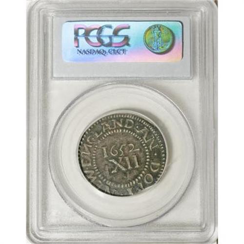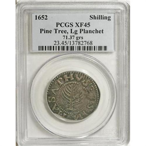 <B>1652 SHILNG Pine Tree Shilling, Large Planchet XF45 PCGS.</B></I> No pellets at trunk. Crosby 1a-C, Noe-10, R.3. This evenly struck and well centered silver shilling is toned deep dove-gray. All legends are complete except for the M on each side, affected by a slender mint-made clip. The absence of marks further ensures the eye appeal. Listed on page 37 of the 2008 <I>Guide Book.</B></I><BR><I>From The Diemer L. Fife Collection.</B></I><BR><BR><b>Shipping:</b> Coins & Currency (<a target="_blank" href="http://www.heritageauctions.com/common/shipping.php">view shipping information</a>)