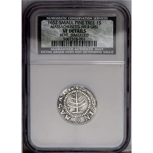<B>1652<img border='0' src='http://www.heritagecoins.com/images/star.gif' width=10 height=10>HILNG> Pine Tree Shilling, Small Planchet--Bent, Damaged--NCS. VF Details.</B></I> Noe-30, Crosby 13-S, R.3. 69.4 grains. The tree, date, and denomination are bold. A mark on the rim above the N in ENGLAND bends the flan in the vicinity. A few tiny digs are on the obverse field near the tree. Dark verdigris is occasionally present, and several peripheral letters on each side are softly struck, as usual for Noe-30. Listed on page 37 of the 2006 <I>Guide Book.</B></I>