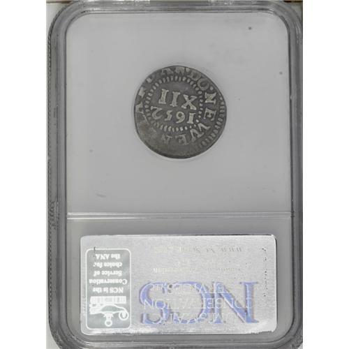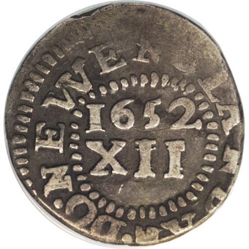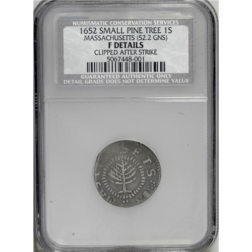 <B>1652<img border='0' src='http://www.heritagecoins.com/images/star.gif' width=10 height=10>HILNG> Pine Tree Shilling, Small Planchet--Clipped After Strike--NCS. Fine Details.</B></I> Noe-16, Crosby 21-L, R.2. 52.2 grains. Most high grade Noe-16 Pine Trees weigh between 70 and 72 grains. Carefully clipped to retain a round shape, with partial loss to the legends on the left side obverse and lower right reverse. Worn on the upper left obverse and on the NG in ENGLAND, but the tree, date, and denomination are bold, as are the majority of the peripheral letters. Listed on page 37 of the 2007 <I>Guide Book.</B></I>