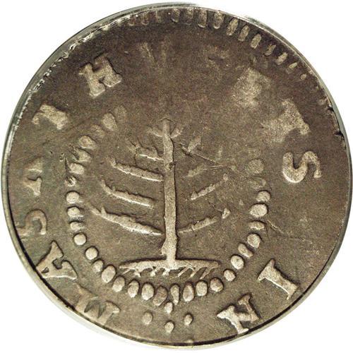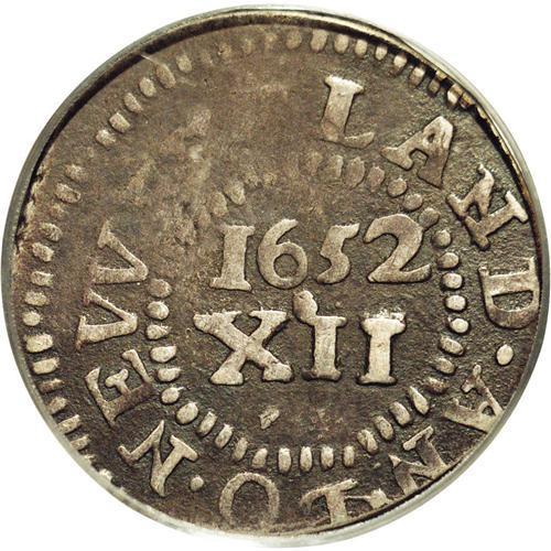 <B>1652<img border='0' src='http://www.heritagecoins.com/images/star.gif' width=10 height=10>HILNG> Pine Tree Shilling, Small Planchet VF25 PCGS.</B></I> Noe-25, Crosby 16-O, R.5. 75.2 grains. Deep brown fields contrast with lighter gray toning on the legends and devices. Generally sharp for the VF25 grade, although each side has a small area of greater wear. Struck a few degrees off center toward 7 o'clock, with the tops of AN DO absent. The usual die state, with a break on the northwest corner of the first I in XII, and slender cracks through the lower reverse. Housed in a green label holder. Listed on page 37 of the 2006 <I>Guide Book.</B></I>