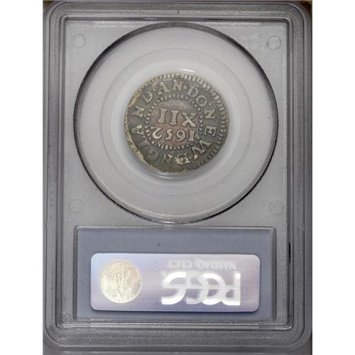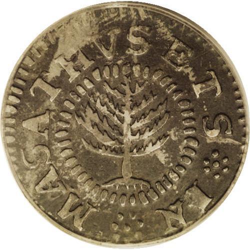 <B>1652<img border='0' src='http://www.heritagecoins.com/images/star.gif' width=10 height=10>HILNG> Pine Tree Shilling, Small Planchet XF40 PCGS.</B></I> Noe-16, Crosby 21-L, R.2. 69.09 grains. The PCGS insert incorrectly asserts the piece as a Large Planchet variety. Mostly deep steel color with hints of pale blue and lilac toning, as well as lighter gray accents. The reverse has evidence of minor adhesive residue. Although this is not a rare variety, and it is available in all grades, the various die states create additional demand. Listed on page 37 of the 2006 <I>Guide Book.</B></I>