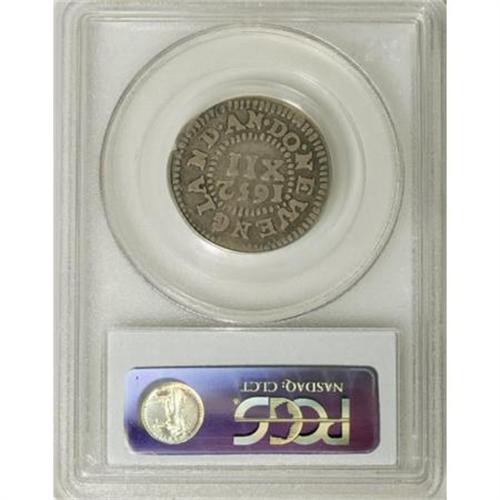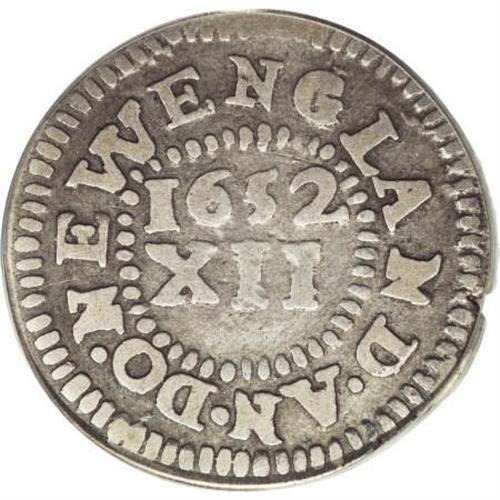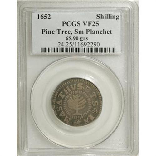 <B>1652 SHILNG Pine Tree Shilling, Small Planchet VF25 PCGS.</B></I> Crosby 21-L, Noe-16, R.2. 65.90 gns. From late dies with breaks in the left-side branches and on the beads beneath the tree. This cream-gray example has full legends and no noticeable marks. A small edge flaw is noted at 8:30. Listed on page 37 of the 2008 Guide Book.<BR><BR><b>Shipping:</b> Coins & Currency (<a target="_blank" href="http://www.heritageauctions.com/common/shipping.php">view shipping information</a>)