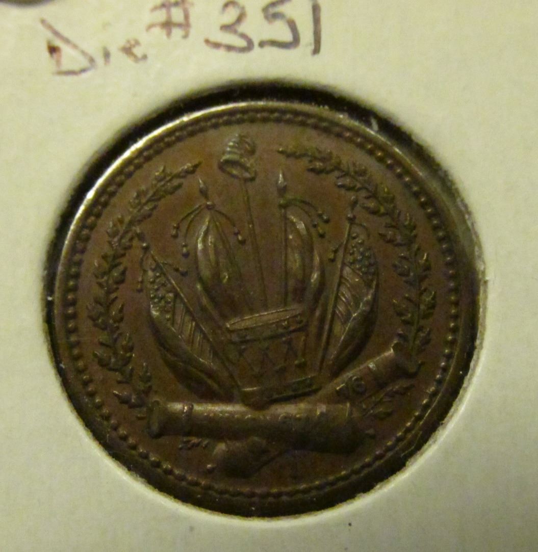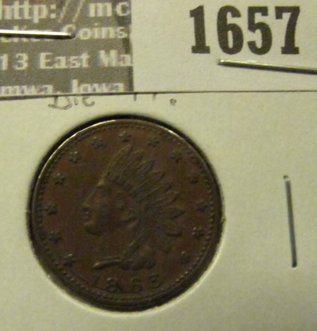 1863 Civil War Token. Indian Head on Obv. Rev Flags Drum and Cannons. EF