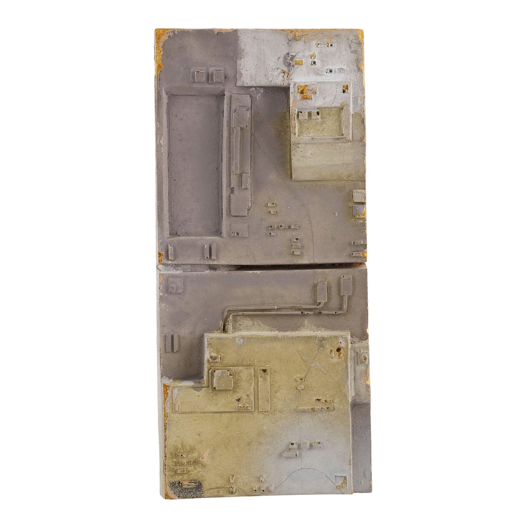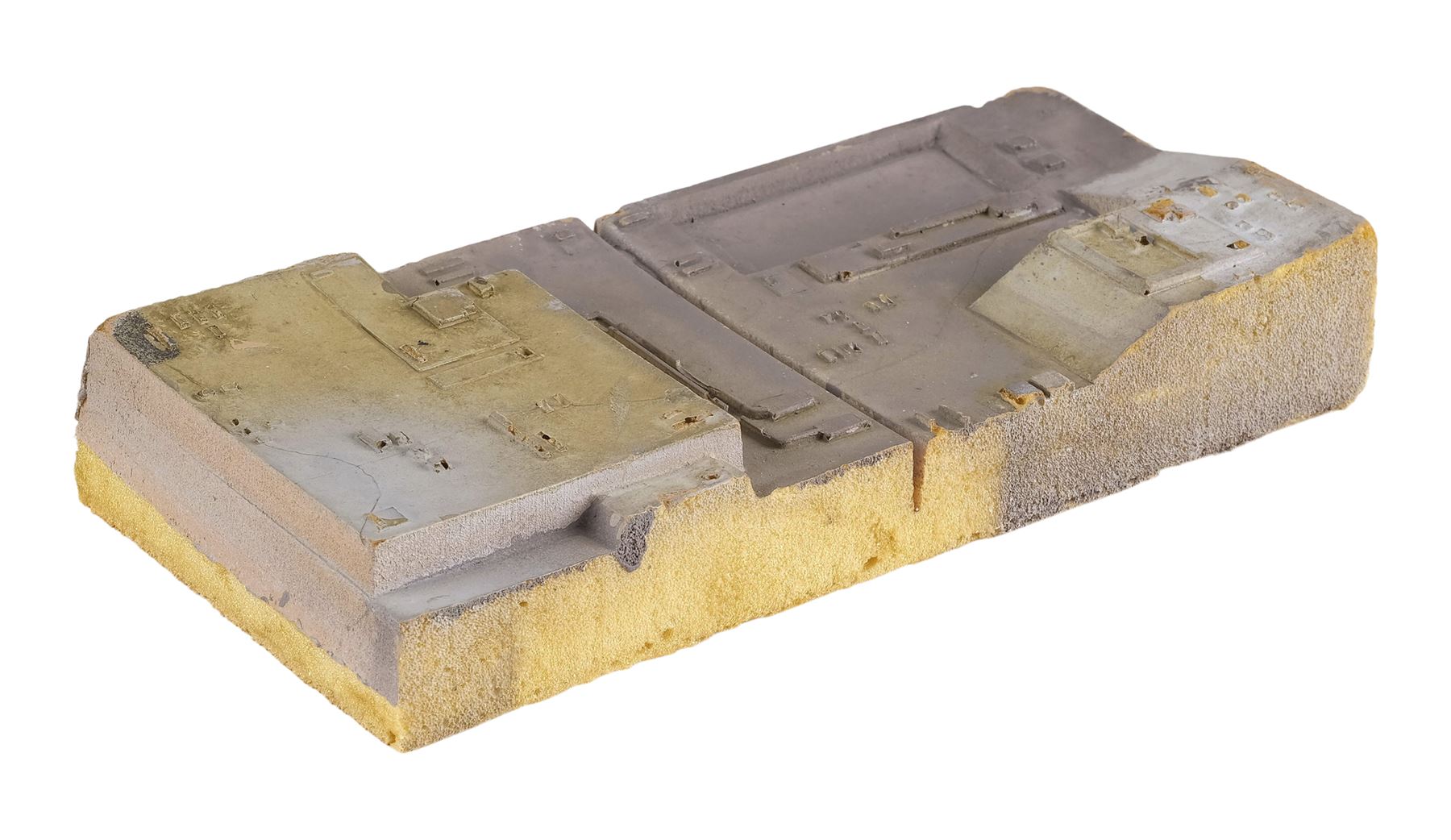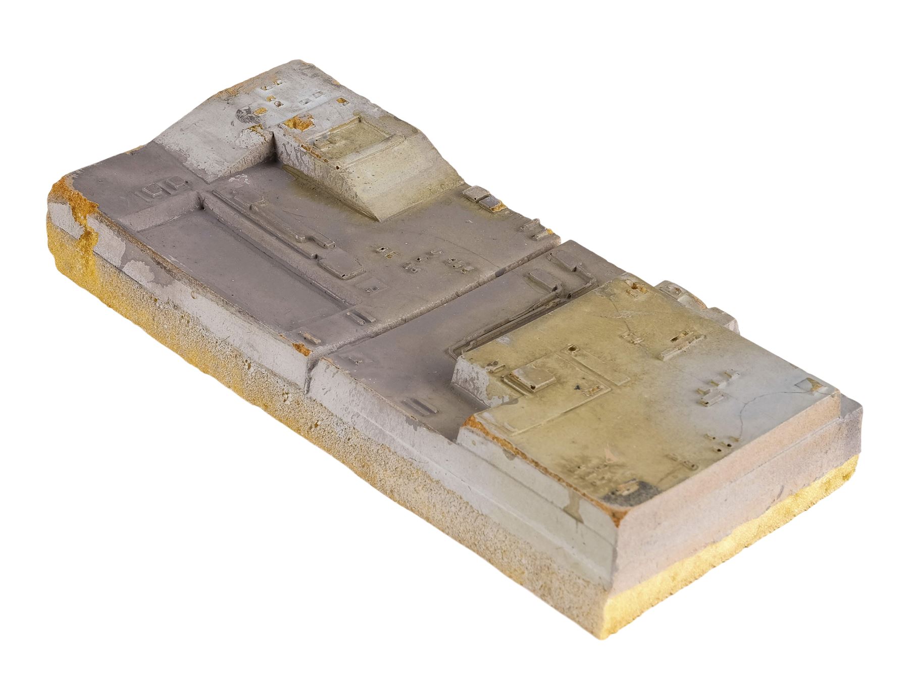 Designed and constructed by Industrial Light & Magic's (ILM) model miniature department, this biscuit foam panel with cast grid-like greeblies on top is painted in shades of gray. It exhibits chipping and staining. Dimensions: 6" x 3" x 1" (15.25 cm x 7.75 cm x 2.75)