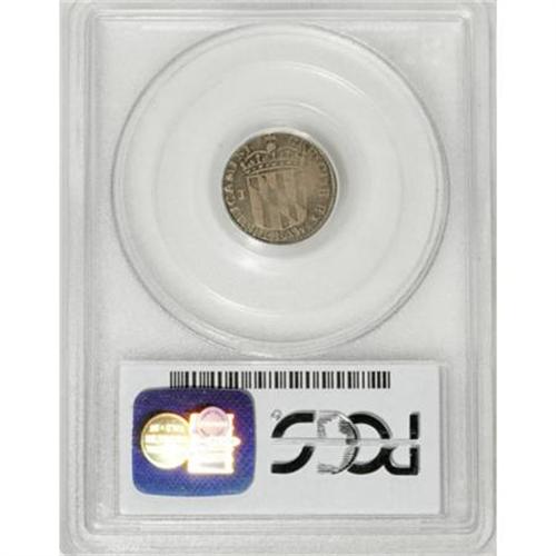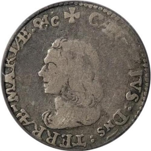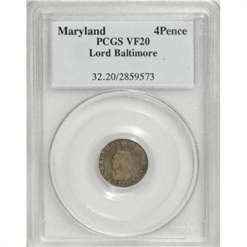<B>(1659) 4PENCE Lord Baltimore Fourpence VF20 PCGS.</B></I> Crosby Pl. III, 3, Breen-74. A hyphen between TERRAE and MARIAE distinguishes this variety from the unique Small Head Breen-75 fourpence. Breen-74 is also a great rarity. None appeared in the Ford auctions, although he owned one of the famous Maryland denarium, the only Lord Baltimore denomination rarer than the fourpence.<BR> The present lavender-gray example is nearly perfect for the grade. It is struck a couple of degrees off center toward 7:30, affecting only a few dentils. The surfaces are unabraded and free from any roughness. The strike is sharp save for selected softness on the right sides, similar (but to a lesser degree) than the Stack's January 2001 example, which attributed the right-side weakness to "axially misaligned dies on the right." Listed on page 38 of the 2008 <I>Guide Book</B></I>. Population: 1 in 20, 2 finer (12/07).<BR><I>Ex: David Bruce Collection (Heritage, 1/02), lot 5023, which realized $8,913.<BR>From The Liberty Collection of United States Colonial Coinage.</B></I><BR><BR><b>Shipping:</b> Coins & Currency (<a target="_blank" href="http://www.heritageauctions.com/common/shipping.php">view shipping information</a>)