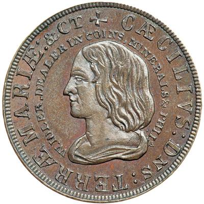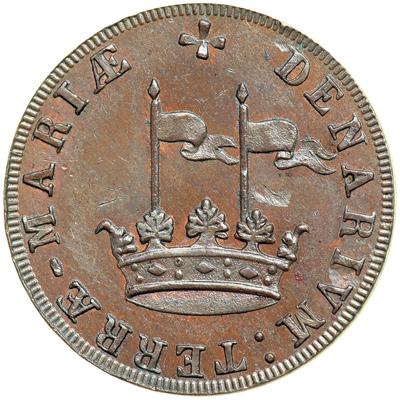 (1659) Idler Imitation of the Maryland Denarium (Penny) Kenney-2 in copper. MS-63. Struck by William Idler circa 1860 as an advertising card. Choice lustrous chocolate and light olive with traces of faded mint color remaining. The fields are smooth and slightly reflective. A premium example of Idler's imitation of the Lord Calvert denarium issued for Maryland in 1659. Weight 77.5 grains.