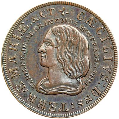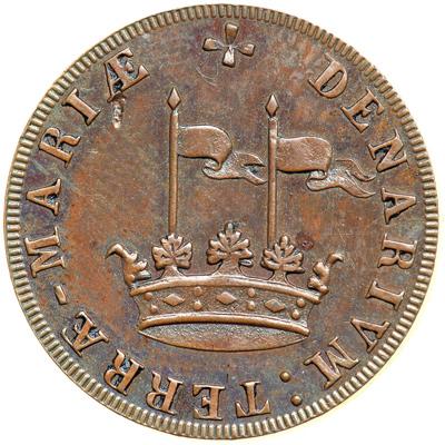 (1659) Idler Imitation of the Maryland Denarium (Penny) Kenney-2 in copper. MS-60. Glossy bluish steel, olive, and chocolate brown. Smooth and mark-free except for a planchet flake at the left top of the reverse, as struck. Similar to the preceding lot. Another nice example of the Idler advertising card that copies the Calvert Maryland denarium. Weight 77.8 grains.