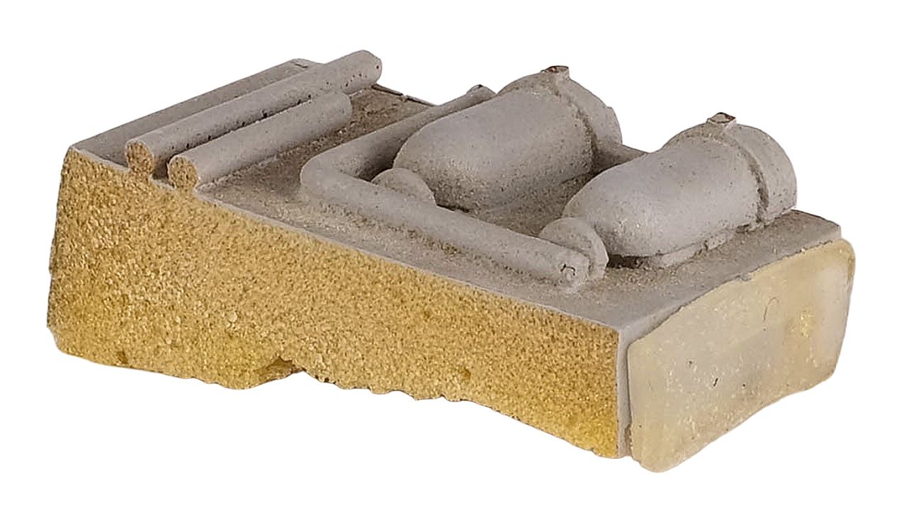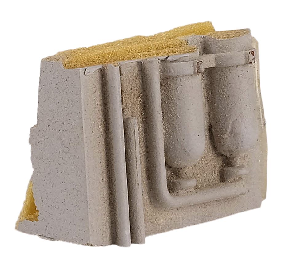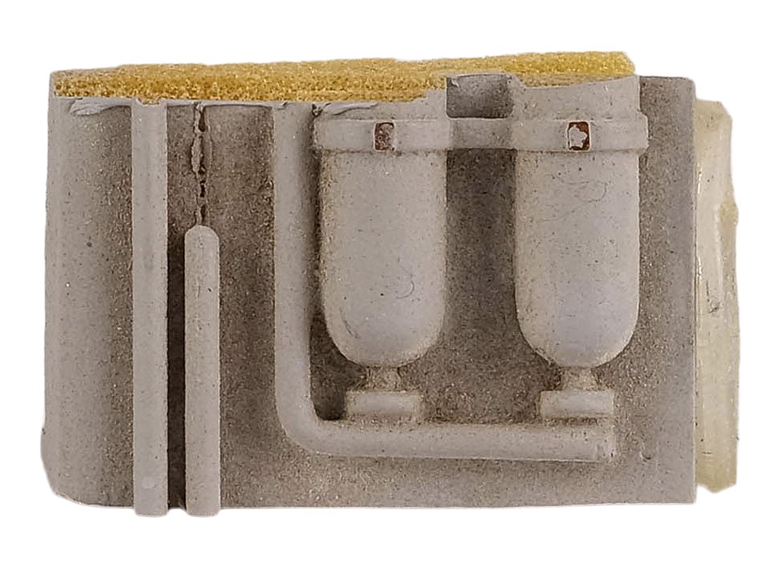 Designed and constructed by Industrial Light & Magic's (ILM) model miniature department, this biscuit foam panel with cast grid-like greeblies on top is painted in shades of gray. Its underside remains unpainted, and it exhibits chipping and staining from production and handling. Dimensions: 1.25" x 0.75" x 0.25" (3.25 cm x 2 cm x 0.75 cm)