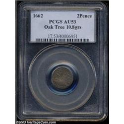 <table><tr><td><TABLE cellSpacing=0 cellPadding=0 width="100%" bgColor=#000000 border=0><TBODY> <TR><TD width="100%"><TABLE cellSpacing=1 cellPadding=3 width="100%" border=0><TBODY><TR><TD width="100%" bgColor=#79735c><FONT face=arial color=#ffffff size=3><B>Description</B> </FONT></TD></TR><TR><TD width="100%" bgColor=#ffffff><FONT face=arial size=2><B>1662 2PENCE Oak Tree Twopence AU53 PCGS.</B></I> Noe-30, Crosby 1-A2, R.4. 10.8 grains. A die break from the 2 in the date to a bead, another from the rim to the A in ENGLAND. A die break from the 2 in the date does not yet reach the 6 in the date. The reverse is well centered and has full legends, while the obverse is about 20% off center at 7 o'clock, affecting IN and MA. Nicely struck, there are no areas of pronounced weakness. The olive-brown surfaces are smooth aside from a faint pinscratch below the date. Listed on page 17 of the 2003 <I>Guide Book.</B></I> Population: 9 in 53, 9 finer (9/03). </FONT></TD></TR></TBODY></TABLE></TD></TR></TBODY></TABLE><BR><A name=PricesRealized></A><TABLE cellSpacing=0 cellPadding=0 width="100%" bgColor=#000000 border=0><TBODY><TR><TD width="100%"><TABLE cellSpacing=1 cellPadding=3 width="100%" border=0><TBODY><TR><TD width="100%" bgColor=#79735c><A name=PR><FONT face=arial color=#ffffff size=3><B>Previous Prices from Heritage Auctions</B> </FONT></A></TD></TR><TR><TD bgColor=#f6f6ed><TABLE cellSpacing=0 cellPadding=0 width="100%" border=1><TBODY><TR><TD align=middle width="33%"><B>Date</B></TD><TD align=middle width="33%"><B>Service</B></TD><TD align=middle width="33%"><B>Price</B></TD></TR><TR bgColor=whitesmoke><TD width="33%"><B>04/27/2002</B></TD><TD width="33%">PCGS</TD><TD width="33%">$4,830.00</TD></TR></TBODY></TABLE></TD></TR><TR><TD bgColor=#ffffff><FONT face=arial size=1 ?>PLEASE NOTE: All prices realized reflect the final hammer price PLUS the buyer's premium in auctions that charge a buyer's premium. Each item has a notation at the top of the listing indicating whether that lot included a buyer's premium. Example: A item that sells with a final hammer price of $100 and a 20% buyer's premium will display with a price realized of $120. All information listed is intended to be as accurate as possible, but errors are possible. Please use this guide carefully and inform us of any inaccuracies. </FONT></TD></TR></TBODY></TABLE></TD></TR></TBODY></TABLE><BR><TABLE cellSpacing=0 cellPadding=0 width="100%" bgColor=#000000 border=0><TBODY><TR><TD width="100%"><TABLE cellSpacing=1 cellPadding=3 width="100%" border=0><TBODY><TR><TD width="100%" bgColor=#79735c colSpan=6><FONT face=arial color=#ffffff size=3><B>Price Guide*</B> </FONT></TD></TR><TR bgColor=#f6f6ed><TD align=middle><B>Grade</B> </TD><TD align=middle><B>Coin World<BR>(Trends)</B> </TD><TD align=middle><B>Numismedia<BR>Retail</B> </TD><TD align=middle><B>Numismedia<BR>Wholesale</B> </TD><TD align=middle><B>Coin<BR>Universe</B> </TD><TD align=middle><B>Heritage<BR>Value Index</B> </TD></TR><TR bgColor=#ffffff><TD align=middle>50</TD><TD align=right>---</TD><TD align=right>---</TD><TD align=right>---</TD><TD align=right>---</TD><TD align=right>---</TD></TR><TR style="FONT-WEIGHT: bold" bgColor=#cccfdd><TD align=middle>53</TD><TD align=right>---</TD><TD align=right>---</TD><TD align=right>---</TD><TD align=right>---</TD><TD align=right>---</TD></TR><TR bgColor=#ffffff><TD align=middle>55</TD><TD align=right>---</TD><TD align=right>---</TD><TD align=right>---</TD><TD align=right>---</TD><TD align=right>---</TD></TR><TR bgColor=#ffffff><TD colSpan=6><FONT size=1>*All information listed is intended to be as accurate as possible, but errors are possible. No item may be returned or refused based on this information which is provided as a service to our customers. You should contact each pricing source directly to determine the accuracy of this information. </FONT></TD></TR></TBODY></TABLE></TD></TR></TBODY></TABLE><BR><TABLE cellSpacing=0 cellPadding=0 width="100%" bgColor=#000000 border=0><TBODY><TR><TD width="100%"><TABLE cellSpacing=1 cellPadding=3 width="100%" border=0><TBODY><TR><TD width="100%" bgColor=#79735c><FONT face=arial color=#ffffff size=3><B>Population Guide</B> </FONT></TD></TR><TR bgColor=#ffffff><TD align=middle><!-- Begin Output of Population Grid--><TABLE cellSpacing=0 cellPadding=0 width="100%" border=0><TBODY><TR><TD vAlign=center><TABLE cellSpacing=0 width="100%" border=1 cellsadding="3"><TBODY><TR><TD vAlign=center><TABLE cellSpacing=0 cellPadding=3 width="100%" border=1><TBODY><TR><TD vAlign=center align=middle bgColor=#f0f1e8 colSpan=2 <CENTER><FONT face=Arial size=2><B>PCGS Pop </B></FONT><CENTER></CENTER></TD><TD vAlign=center align=middle bgColor=#f0f1e8 colSpan=2><CENTER><FONT face=Arial size=2><B>NGC Pop</B></CENTER></FONT></TD></TR><TR><TD vAlign=center><FONT face=Arial size=2>(53)</FONT> </TD><TD vAlign=center align=right><FONT face=Arial size=2>9</FONT> </TD><TD vAlign=center><FONT face=Arial size=2>(53)</FONT> </TD><TD vAlign=center align=right><FONT face=Arial size=2>0</FONT> </TD></TR><TR><TD vAlign=center><FONT face=Arial size=2>(>53)</FONT> </TD><TD vAlign=center align=right><FONT face=Arial size=2>9</FONT> </TD><TD vAlign=center><FONT face=Arial size=2>(>53)</FONT> </TD><TD vAlign=center align=right><FONT face=Arial size=2>0</FONT> </TD></TR></TBODY></TABLE></TD></TR></TBODY></TABLE></TD></TR></TBODY></TABLE><!-- End Output of Population Grid--></TD></TR></TBODY></TABLE></TD></TR></TBODY></TABLE><BR><TABLE cellSpacing=0 cellPadding=0 width="100%" bgColor=#000000 border=0><TBODY><TR> Important notice: Heritage usually auctions material at the rate of 200-250 lots per hour. On some occasions eBay Live bid software or the Internet may not be able to keep up with the pace of the auction. We recommend placing a realistic absentee bid now as insurance to avoid disappointment. Occasionally the auctioneer may eliminate or reject an eBay Live bid, and the auctioneer may also reopen a lot after the close of the e