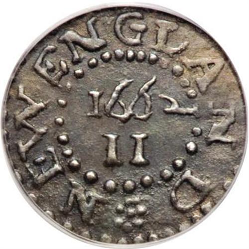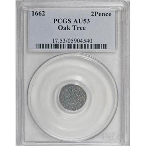 <B>1662 2PENCE Oak Tree Twopence AU53 PCGS.</B></I> Small 2 in date. Crosby 1-A2, Noe-29, R.6. The flan is well rounded, with a good centered impression that leaves almost all of IN MASATHVSETS and NEW ENGLAND on the planchet, despite slight misalignment toward 7 o'clock. The tree is fully struck, and moderate steel-gray toning covers each side. A nice piece, listed on page 36 of the 2008 <I>Guide Book</B></I>. <BR><BR><b>Shipping:</b> Coins & Currency (<a target="_blank" href="http://www.heritageauctions.com/common/shipping.php">view shipping information</a>)