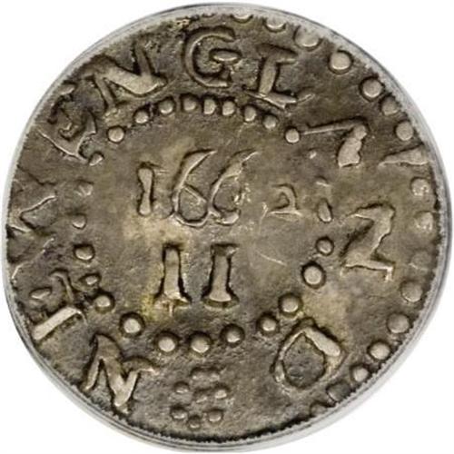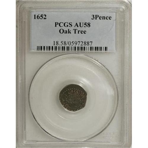 <B>1662 2PENCE Oak Tree Twopence AU58 PCGS.</B></I> Small Date. Noe-29, Crosby 1-A2. High R.6. Incorrectly identified as a threepence on the PCGS insert. This remarkable example has a fully struck tree, and the reverse legends are essentially complete. The obverse is misaligned toward 6 o'clock, taking a few letters partially off the flan, and a faint wave beneath the date is also of mint origin. Unabraded save for a couple of trivial reverse marks unworthy of further mention, and rich plum-gray and forest-green toning contributes further to the eye appeal. Locating a more attractive example would prove to be a Herculean task. Listed on page 36 of the 2008 <I>Guide Book.</B></I> Population: 6 in 58, 5 finer (6/07).<BR><BR><b>Shipping:</b> Coins & Currency (<a target="_blank" href="http://www.heritageauctions.com/common/shipping.php">view shipping information</a>)
