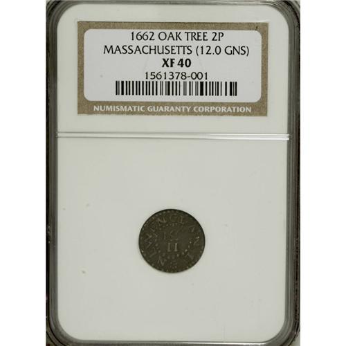 <B>1662 2PENCE Oak Tree Twopence XF40 NGC.</B></I> Noe-29, Crosby 1-A2, R.6. 12.0 grains. This lovely twopence has a fully defined tree and rich lavender-gray toning. The obverse is moderately misaligned toward 6 o'clock, but the reverse is perfectly centered and has complete peripheral legends. The moderate wave imparted by the rocker press caused a soft impression on the 2 in the date, and wispy marks are present near 1 o'clock on the obverse. Listed on page 36 of the 2007 <I>Guide Book.</B></I><BR><BR><b>Shipping:</b> Coins & Currency (<a target="_blank" href="http://www.heritageauctions.com/common/shipping.php">view shipping information</a>)