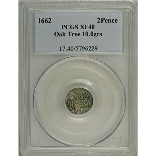 <B>1662 2PENCE Oak Tree Twopence XF40 PCGS.</B></I> Small Date. Noe-29, Crosby 1-A2. High R.6. 10.0 grains. The small and distant 2 identifies this rare Noe variety. A nicely detailed example with apple-green and rose patina. Softness of strike is limited to the right reverse border. The obverse is misaligned toward 4:30, affecting a few peripheral letters. A light pinscratch is noted at 3 o'clock on the reverse. Listed on page 36 of the 2007 <I>Guide Book.</B></I><BR><I>From The Jones Beach Collection.</B></I><BR><BR><b>Shipping:</b> Coin/Currency (<a target="_blank" href="http://www.heritageauctions.com/common/shipping.php">view shipping information</a>)