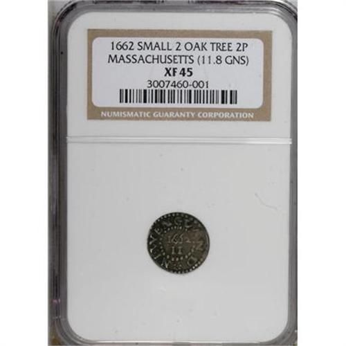 <B>1662 2PENCE Oak Tree Twopence XF45 NGC.</B></I> Small 2 in date. Crosby 1-A2, Noe-29, R.6. 11.8 gns. This mark-free twopence has surprising sharpness on the tree, since every branch is distinct. The silver-gray legends and motifs contrast with the deep cream-gray to ebony fields. The obverse is well centered, while the reverse is misaligned several degrees toward 5:30. Listed on page 36 of the 2008 <I>Guide Book.</B></I><BR><BR><b>Shipping:</b> Coins & Currency (<a target="_blank" href="http://www.heritageauctions.com/common/shipping.php">view shipping information</a>)