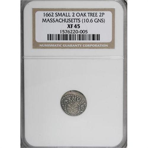 <B>1662 2PENCE Oak Tree Twopence XF45 NGC.</B></I> Crosby 1-A3, Noe-31, High R.6. A horizontal die break from the top of the 2 in the date identifies the rare Noe-31 variety. An evenly struck slate-gray and apple-green representative. The obverse is misaligned toward 6 o'clock, but the tree is fully intact. Slightly wavy, as made from a rocker press. A thin mark passes through the N in NEW, but the piece is generally smooth. Listed on page 36 of the 2008 <I>Guide Book.</B></I><BR><BR><b>Shipping:</b> Coins & Currency (<a target="_blank" href="http://www.heritageauctions.com/common/shipping.php">view shipping information</a>)
