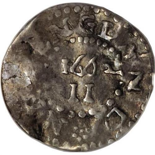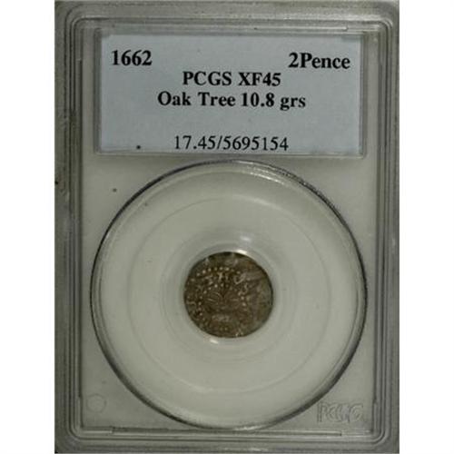 <B>1662 2PENCE Oak Tree Twopence XF45 PCGS.</B></I> Small Date. Crosby 1-A2, Noe-30, R.4. 10.8 gn. Powder-blue and lilac-gray graces this scarce denomination Massachusetts silver piece. The date and denomination are bold, as is the tree aside from its roots. The peripheral legends are unevenly struck, and the borders have a lumpy appearance, as produced. The obverse is misaligned toward 7:30, while the reverse is well centered. Listed on page 36 of the 2008 Guide Book.<BR><BR><b>Shipping:</b> Coins & Currency (<a target="_blank" href="http://www.heritageauctions.com/common/shipping.php">view shipping information</a>)