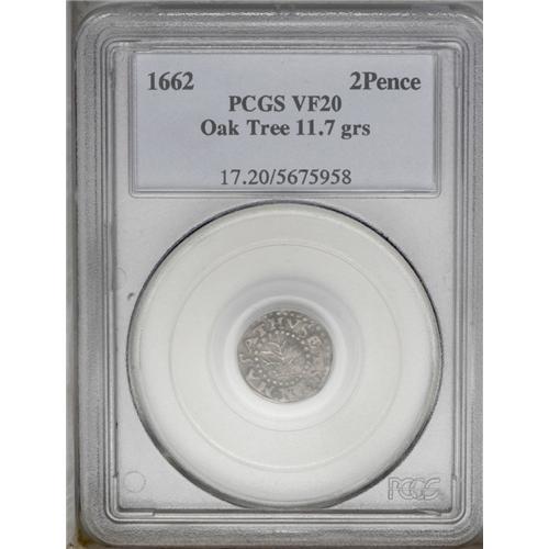 1662 Oak Tree Twopence VF20 PCGS. Small 2. Breen-35. No 1662 Oak Tree Twopence VF20 PCGS.