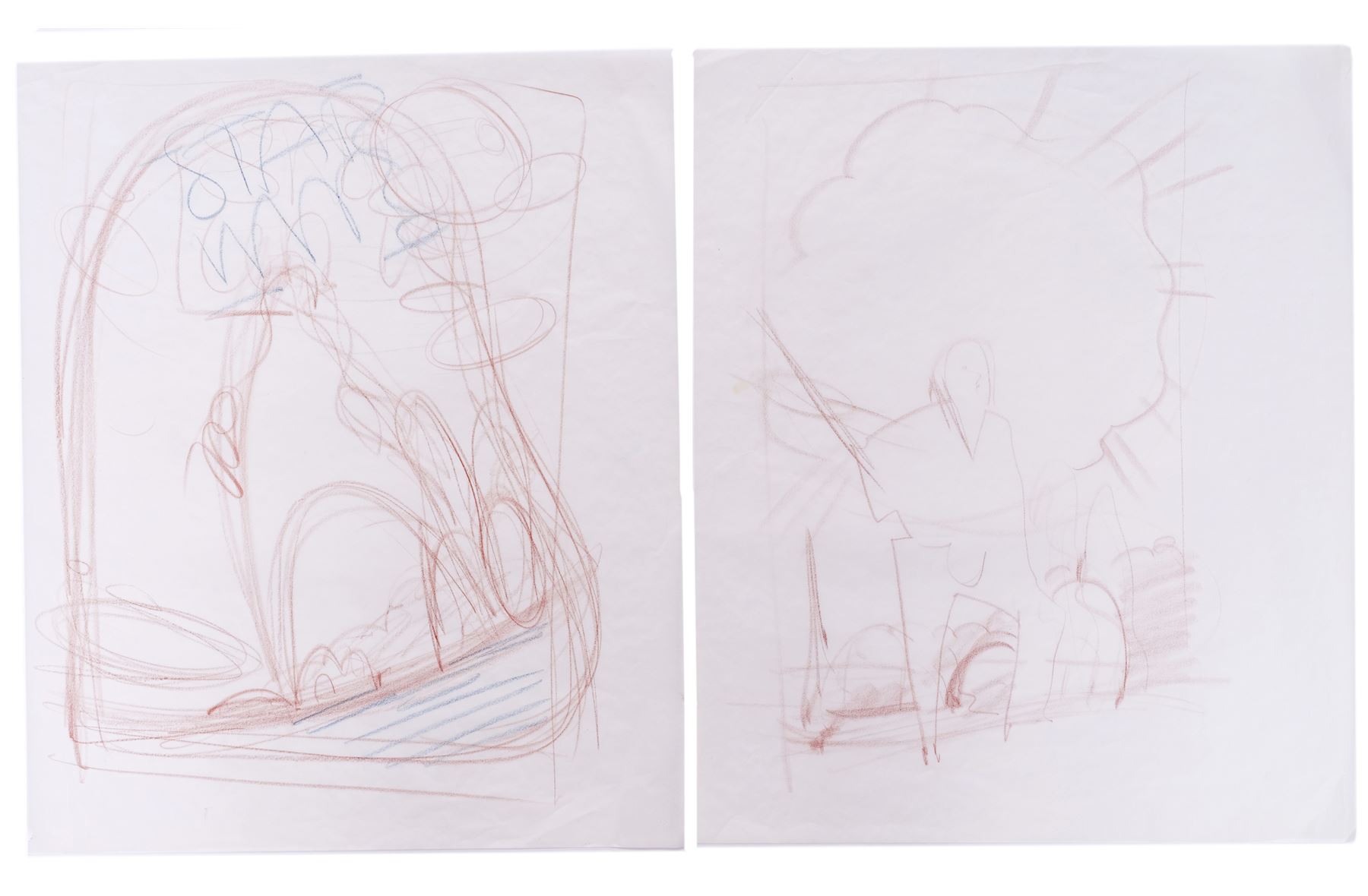 This lot comes from the personal collection of William Plumb. It consists of five hand-drawn sketches of basic shapes and designs on vellum. Rendered in brown and blue colours, these sketches feature annotations in the margins for design notes such as "shadows," "raiders," "Vader," "X-Wing," and "Luke." This lot exhibits creasing and fold lines with minor discoloration from age. Dimensions: (each) 17.5" x 14.5" (44.5 cm x 37 cm)