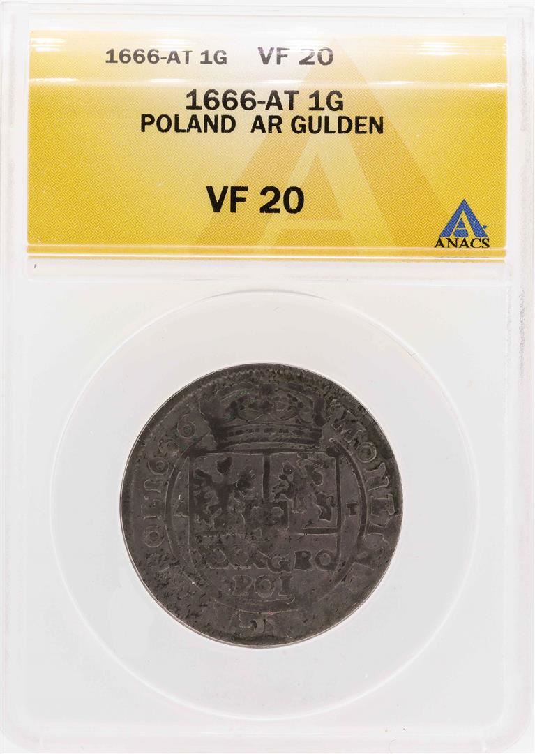 One 1666-AT Poland AR Gulden Coin ANACS VF20. ANACS Appraised.