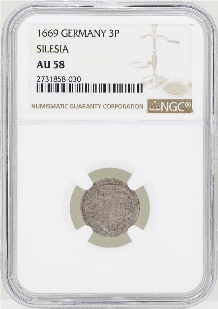 One 1669 Germany 3 Pfennig Silesia Coin NGC AU58. NGC Certified.