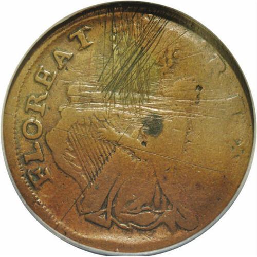 <B>(1670-75)<FARTH> St. Patrick Farthing--Reverse Damage--NCS. Fine Details.</B></I> This is a desirable example with attractive olive color and smooth surfaces, <I>except,</B></I> some misguided soul attempted to scratch off the brass splasher on the reverse. There is also a single corrosion spot near the reverse center. Listed on page 39 of the 2006 <I>Guide Book.</B></I><BR><I>From The Steve Glenn Collection, Part Two.</B></I>