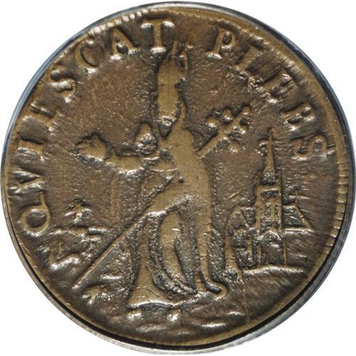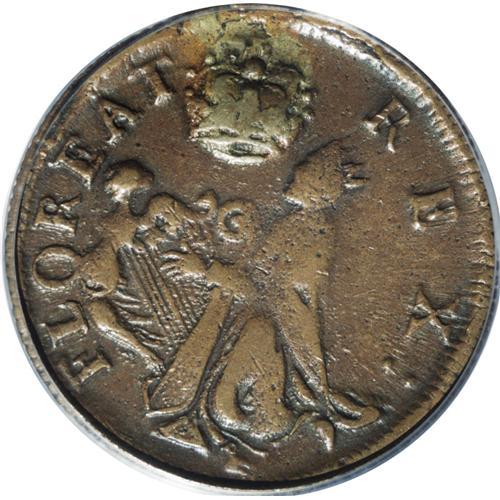 <B>(1670-75) FARTH St. Patrick Farthing XF45 PCGS.</B></I> Breen-218, martlet alone below king. Breen considered this variety to be very rare. A martlet is a heraldic bird without feet. This is a beautiful chocolate-brown farthing with a smooth and pleasing appearance. Minor die rust is of mint origin. The brass splasher is well centered on the crown. Listed on page 39 of the 2008 <I>Guide Book.</B></I> Population: 6 in 45, 7 finer (4/07).<BR><BR><b>Shipping:</b> Coins & Currency (<a target="_blank" href="http://www.heritageauctions.com/common/shipping.php">view shipping information</a>)