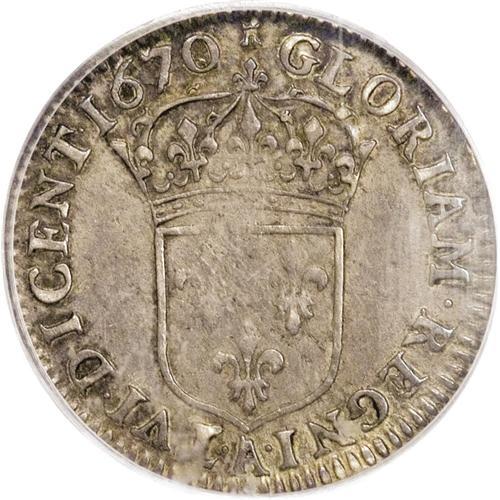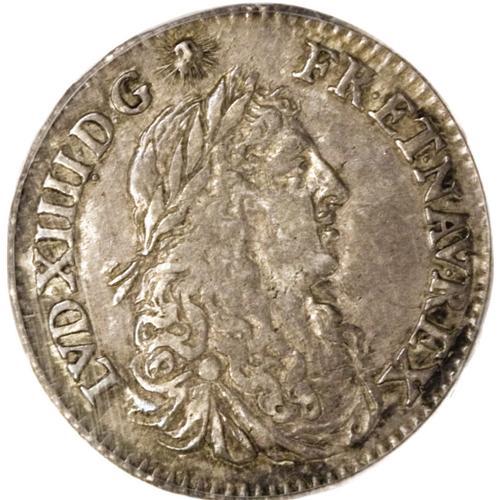 <B>1670-A<5SOL> French Colonies 5 Sols AU53 PCGS.</B></I> Breen-256, "Rare." Original medium gray patina covers this lightly marked and decidedly scarce silver issue. Long-reigning Louis XIV was known as the "Sun King," and it is appropriate that a small sun is depicted in the field above the king. Not fully brought up in the centers, as usual for the type. Listed on page 50 of the 2007 <I>Guide Book.</B></I>
