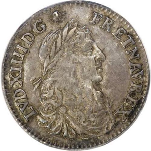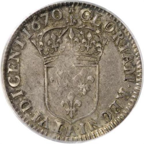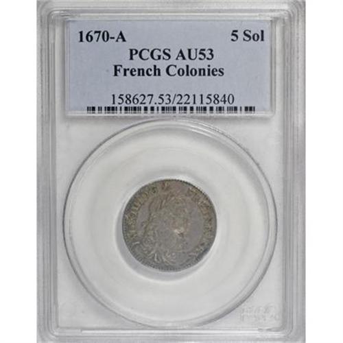 <B>1670-A 5SOL French Colonies 5 Sols AU53 PCGS.</B></I> Breen-256, "Rare." Original medium gray patina covers this lightly marked and decidedly scarce silver issue. Long-reigning Louis XIV was known as the "Sun King," and it is appropriate that a small sun is depicted in the field above the king. Not fully brought up in the centers, as usual for the type. Listed on page 50 of the 2008 <I>Guide Book.</B></I><BR><BR><b>Shipping:</b> Coins & Currency (<a target="_blank" href="http://www.heritageauctions.com/common/shipping.php">view shipping information</a>)