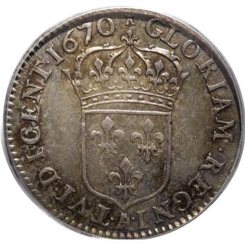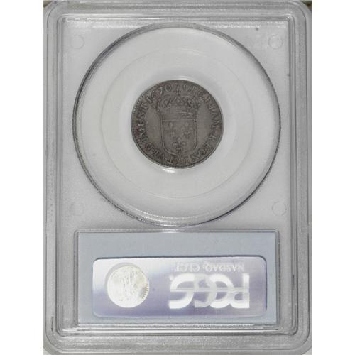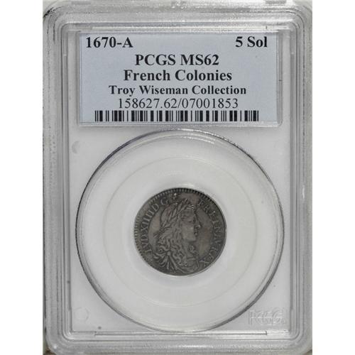 <B>1670-A 5SOL French Colonies 5 Sols MS62 PCGS.</B></I> Breen-256. Breen (1988) classified this issue under "coinages intended for French America." Well struck in the centers, unlike other pieces seen. A satiny dove-gray example that offers glimpses of russet and cobalt-gray peripheral toning. Listed on page 50 of the 2007 <I>Guide Book.</B></I><BR><I>From The Troy Wiseman Collection, Part Two.</B></I><BR><BR><b>Shipping:</b> Coin/Currency (<a target="_blank" href="http://www.heritageauctions.com/common/shipping.php">view shipping information</a>)