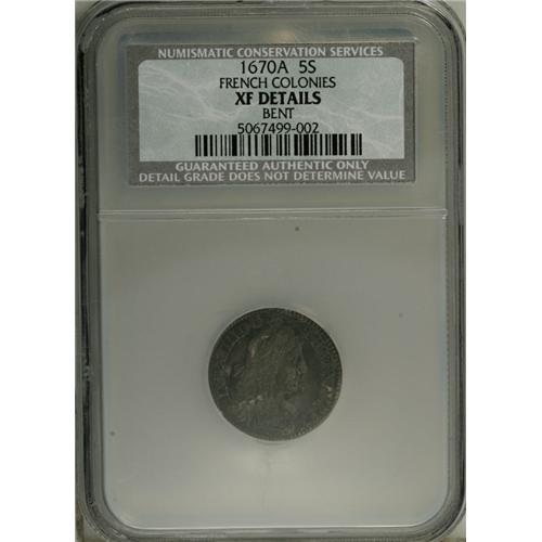 <B>1670-A 5SOL French Colonies 5 Sols--Bent--NCS. XF Details.</B></I> Struck at the Paris Mint, with an officially recorded mintage of 200,000 pieces, these coins and their 15 Sol counterparts were intended for circulation in France's North American colonies. This example is bent but displays nice XF details and deep greenish-brown toning over each side. Free of abrasions.<BR><BR><b>Shipping:</b> Coin/Currency (<a target="_blank" href="http://www.heritageauctions.com/common/shipping.php">view shipping information</a>)