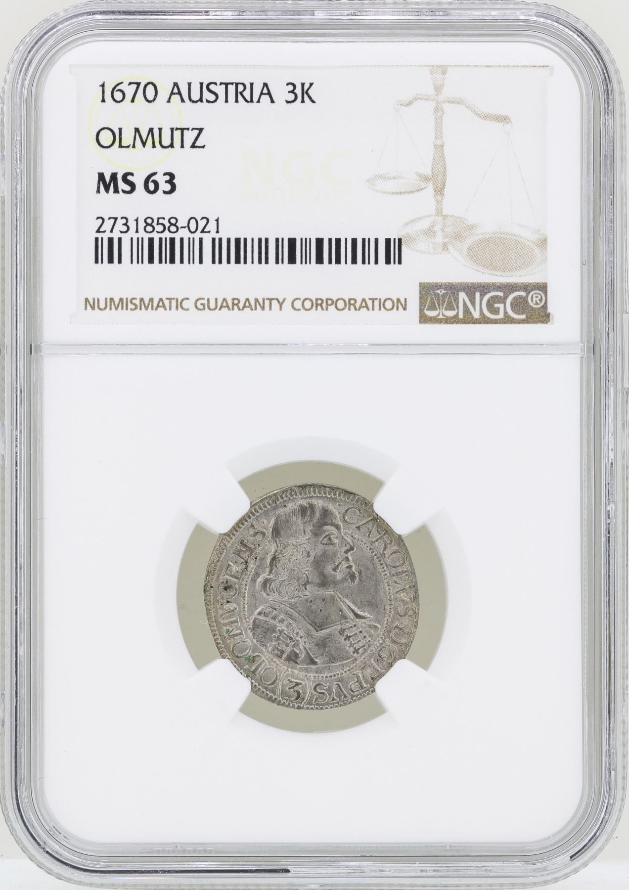 One 1670 Austria 3 Kreuzer Olmutz Coin NGC MS63.