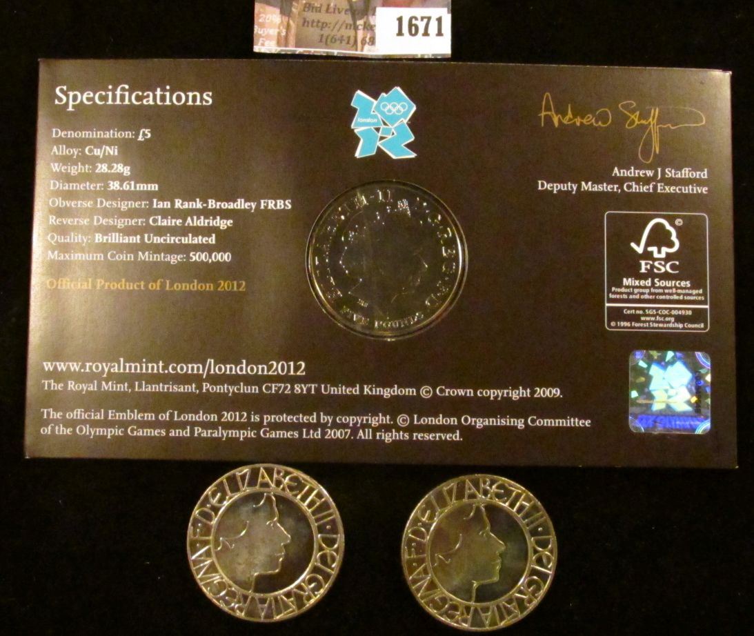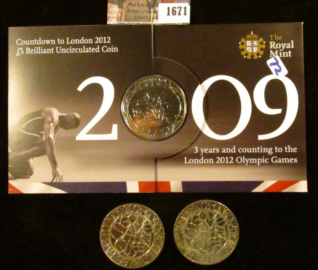 Two God Save The Queen 2003 5 Pound Coins Commemorating The Coronation Jubilee. Countdown To London 2009 5 Pounds Coin and Info Set