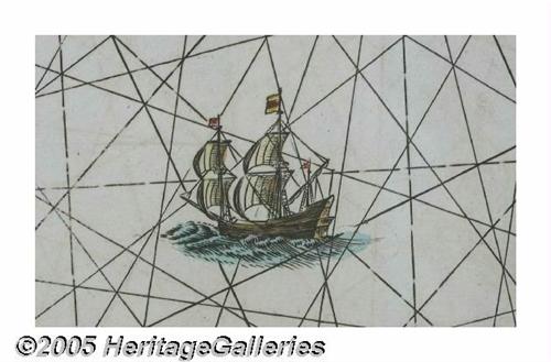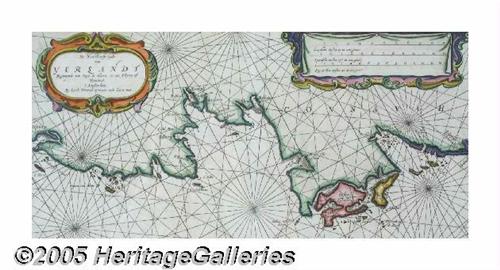 <B>1679 Hand-colored Map of Northwest Coast of Ireland by Theunisz</B></I> <I>"De Noordwest zyde van Yerlandt. Beginnende van Capo de Hoorn; tot aen Schynes, ofte Slynehead. t Amsterdam By Iacob Teunisz op't water inde Loots-man."</B></I> A detailed sea chart showing the Southern part of the Northwest coast of Ireland. Features a large decorative title cartouche in the upper left corner, as well two compass roses, a ship and a mileage scale to convert Dutch, Spanish, English and French leagues to degrees. Likely from <I>"Nieuw en Groote Loots-Man Zee Spiegel, Ofte lichtende Colomme."</B></I> Excellent condition, 21" x 17" in size, professionally and elaborately matted and framed to 37" x 34". Lot:253