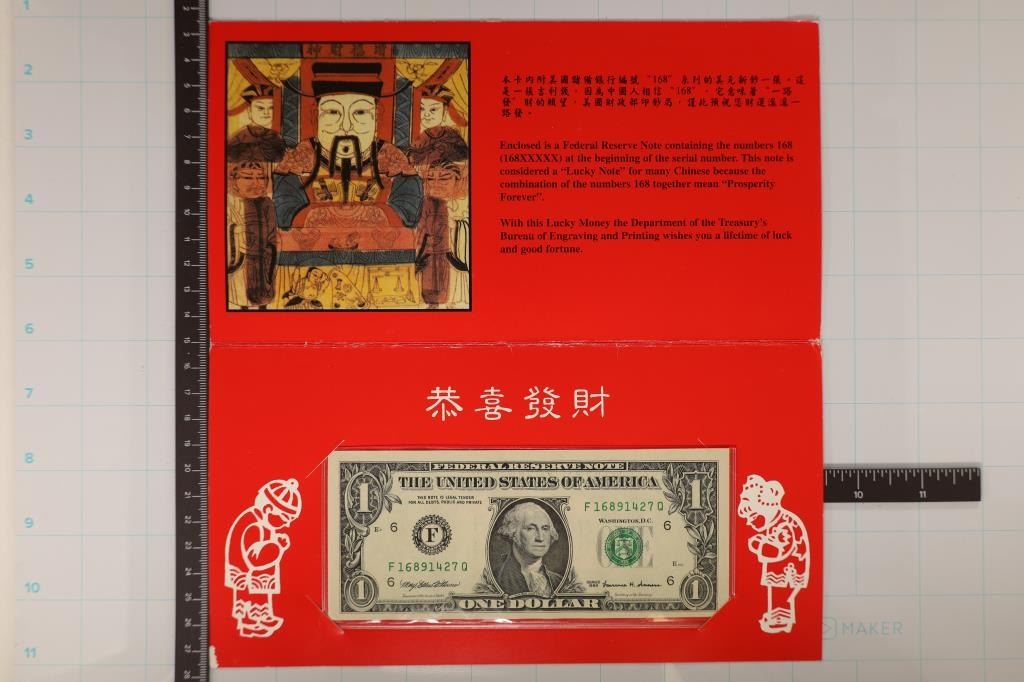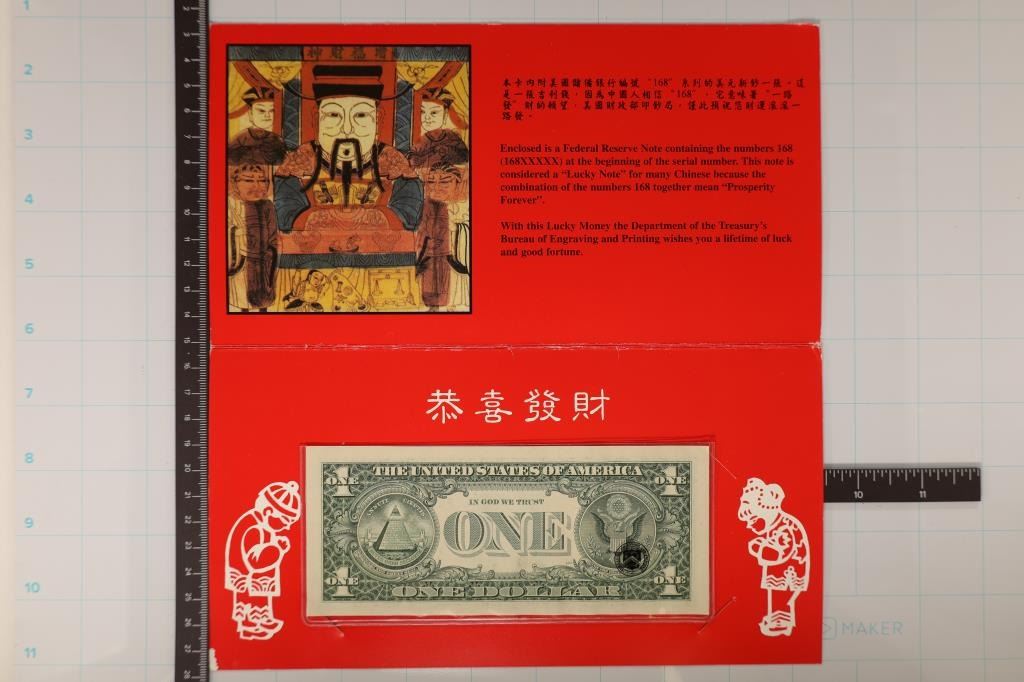 FRN WITH SERIAL NUMBER STARTING IN "168" CRISP UNC IN ORIGINAL BEP PACKAGING. CONSIDERED A LUCKY MONEY NOTE FOR MANY CHINESE BECAUSE THE COMBINATION ON THE NUMBERS "168" TOGETHER MEAN "PROSPERITY