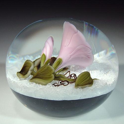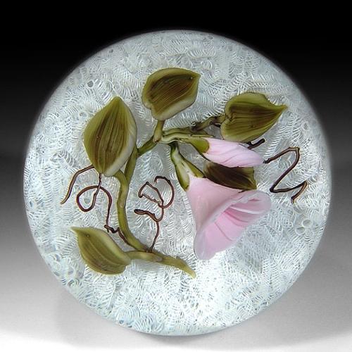 Victor Trabucco 2000 morning glory paperweight, containing a pale pink morning glory on a vine, with a pink bud, green leaves, and tendrils, on white upset muslin. Signed/dated. Diameter 3 1/8". NO RESERVE