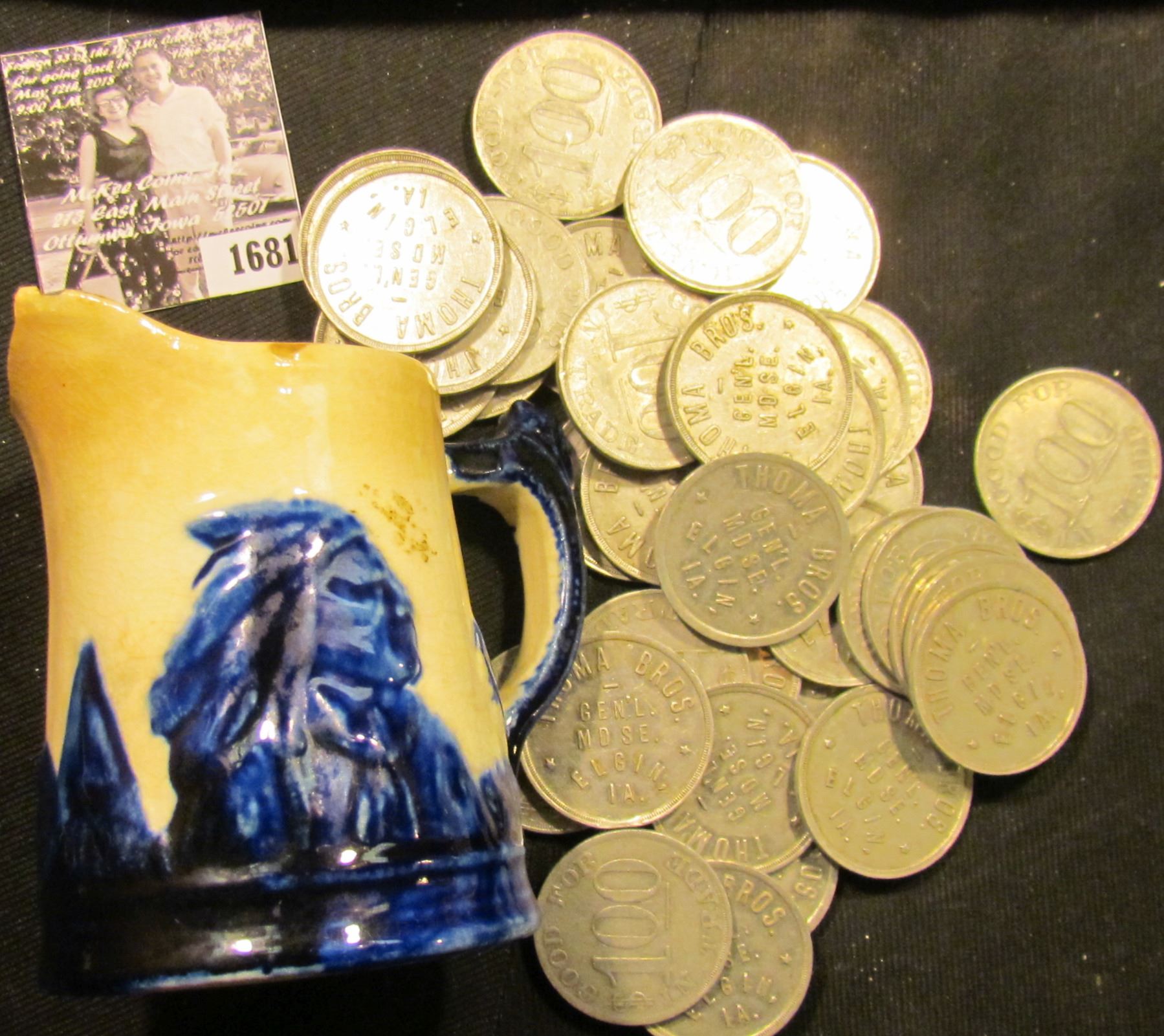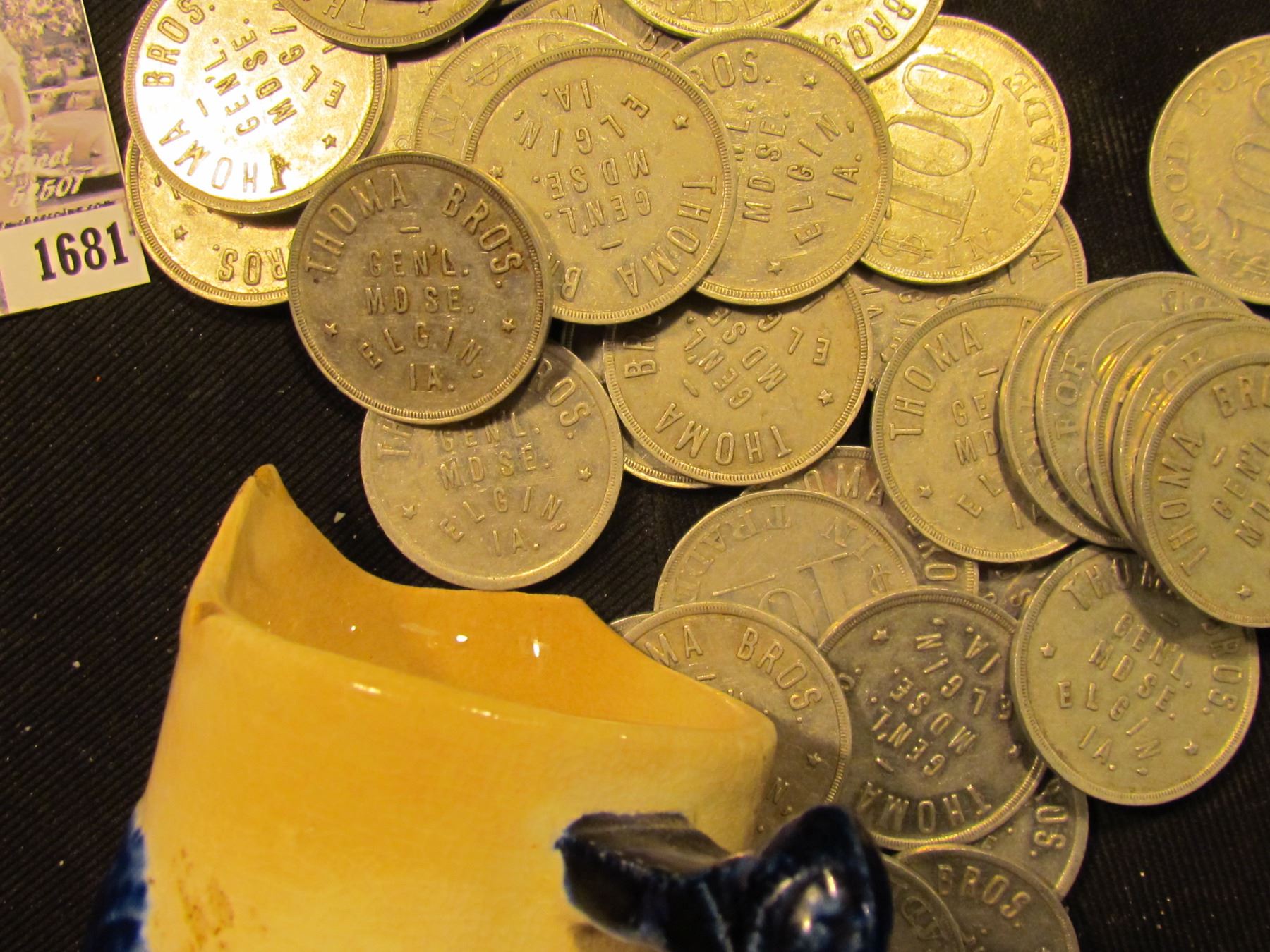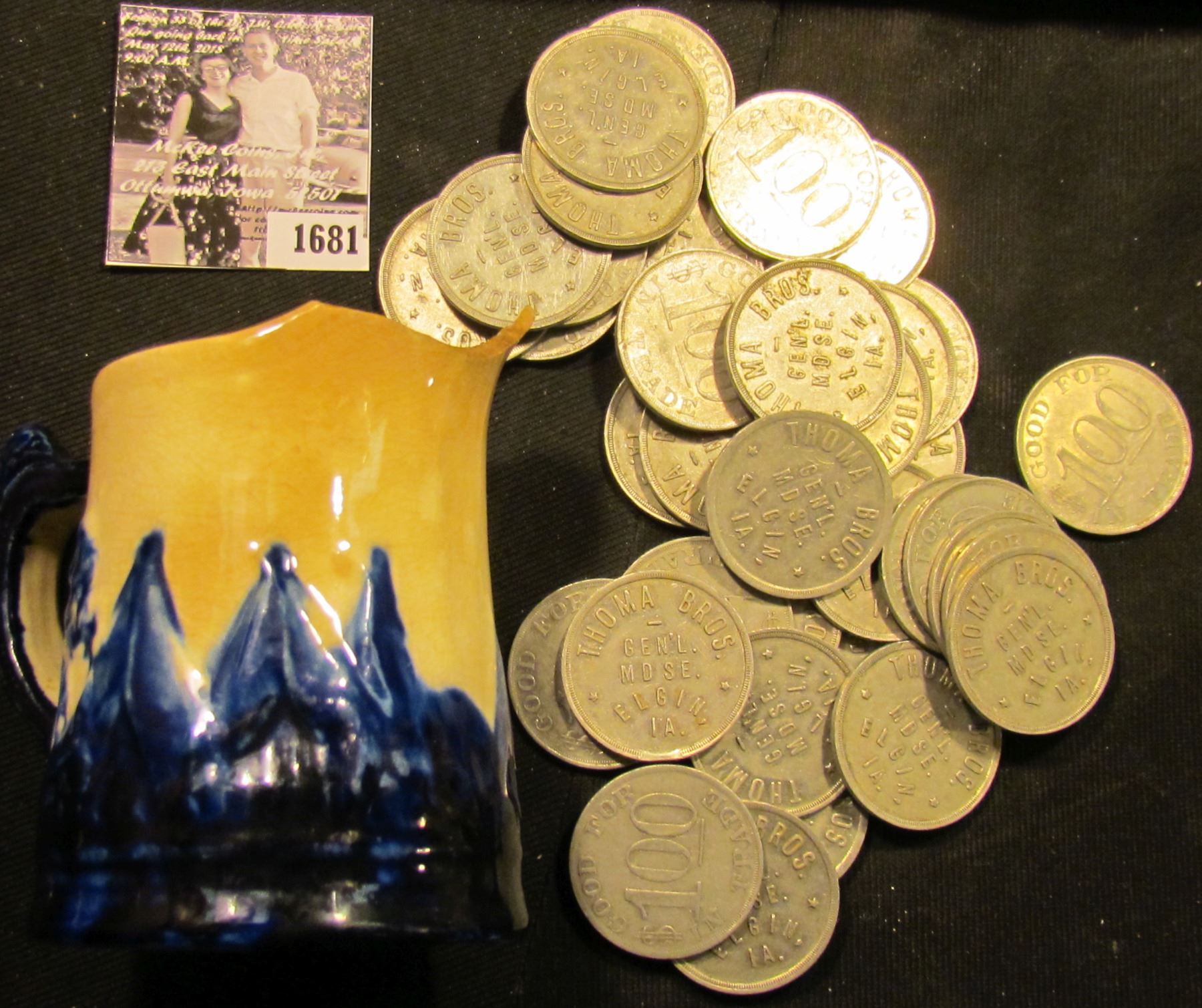 1681 . Small Sleepy Eye Cream Pitcher. Part of Spout missing. “42s”; & (37) “Good For/$1.00/In Trade”, “Thoma Bros./Gen’l./Mdse./Elgin,/Ia.” Tokens, rd., al., 35mm.