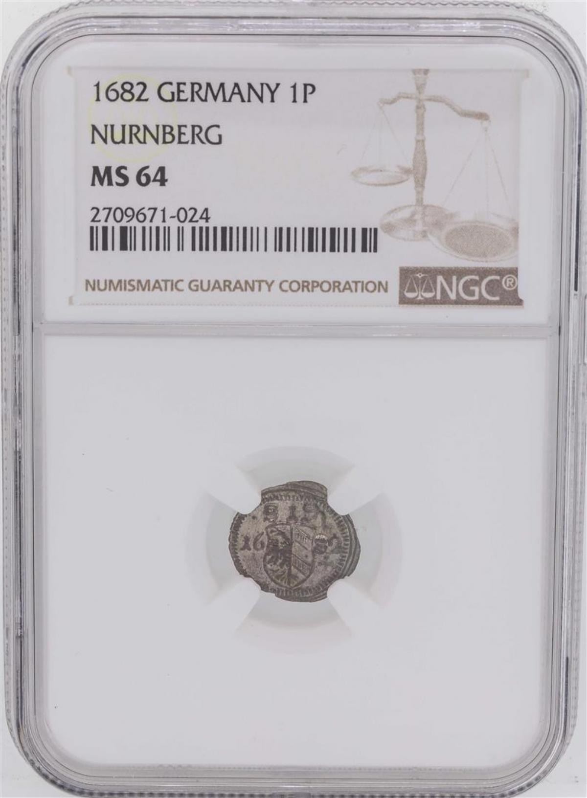 One 1682 Germany 1 Pfennig Nurnberg Coin NGC MS64. NGC Certified.