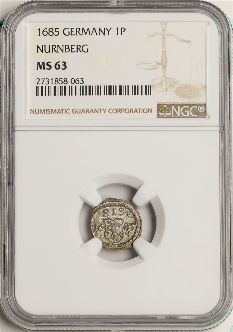 One 1685 Germany Nurnberg Pfennig Coin NGC MS63. NGC Certified.