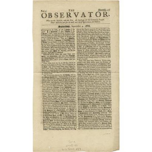 <B>1686 Edition of </B></I><B><I>The Observator</B></I></B></I><B>, a London Newspaper</B></I>. Two pages, 7.5” x 12”, London, September 4, 1686, possibly disbound from a book, toned, especially at the edges, else in near fine condition. <I>The Observator</B></I> was published from April 13, 1681 until 1686 or possibly 1687. It was published under the auspices of Roger L'Estrange, an English pamphleteer and author, and staunch defender of royalist claims. In 1644 he led a conspiracy in support of King Charles I and was sentenced to death as a spy, but after serving four years' imprisonment he was able to escape to the Continent. <I>Ex. Henry E. Luhrs Collection</B></I>.<BR><BR><BR><b>Shipping:</b> Flat Material, Small (<a target="_blank" href="http://www.heritageauctions.com/common/shipping.php">view shipping information</a>)