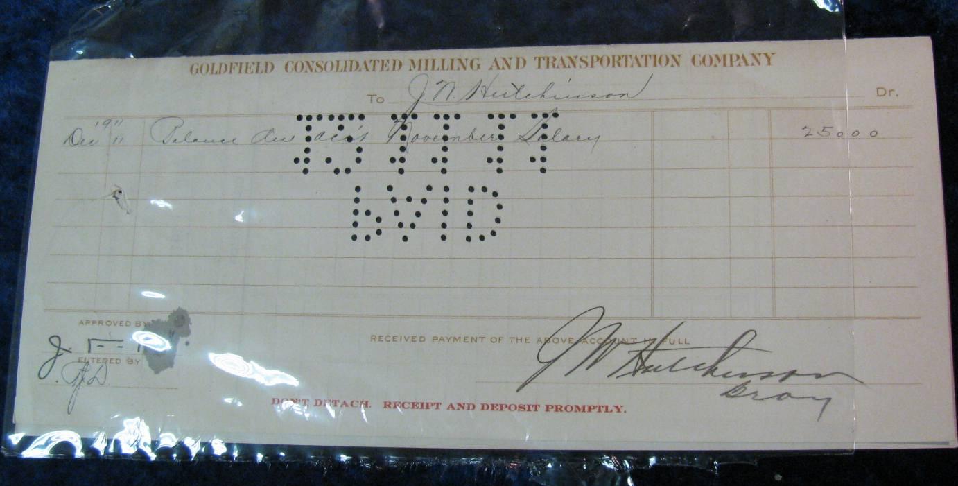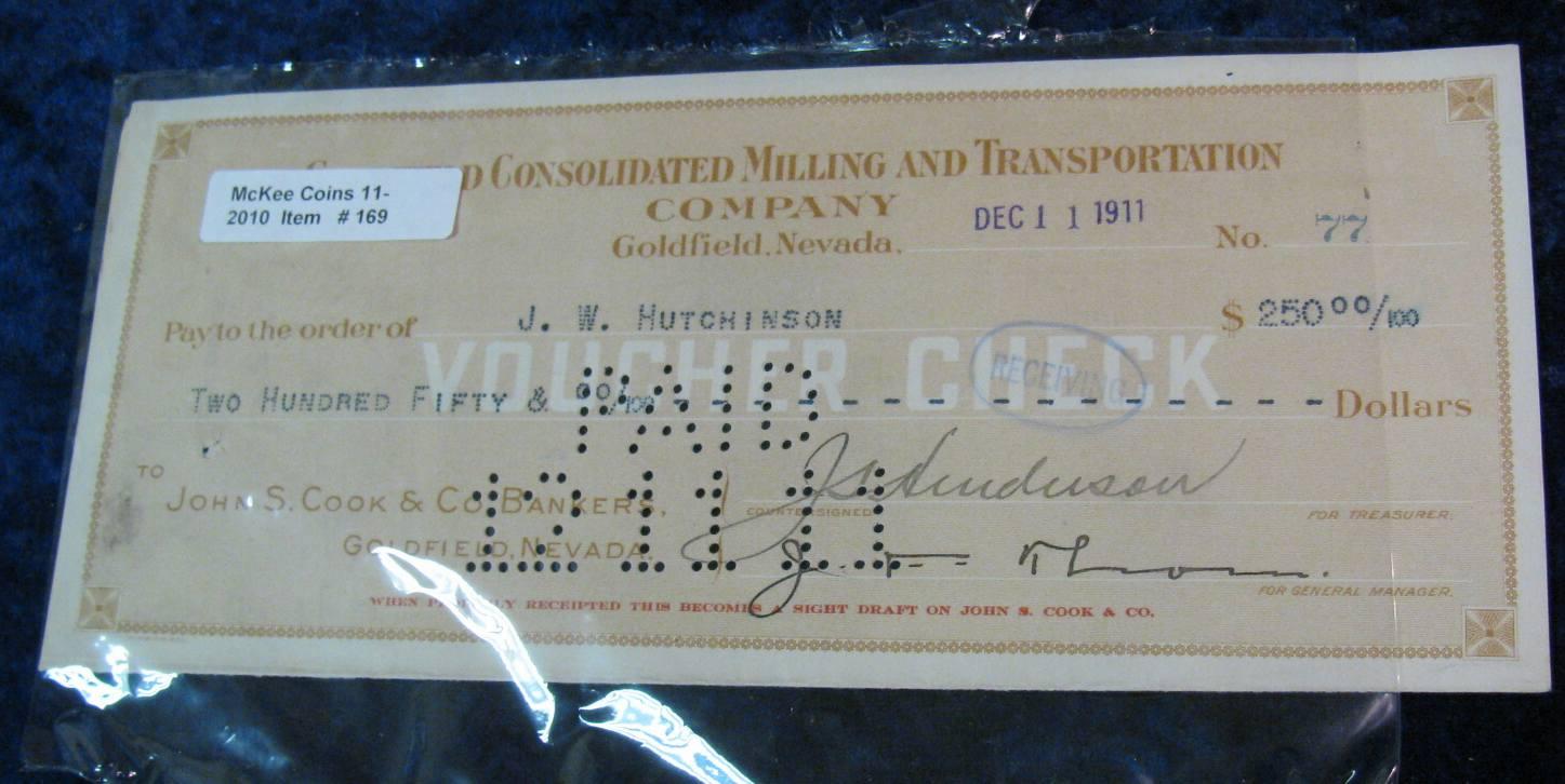 169. 1911 $250 Check "Goldfield Consolidated Milling and Transportation Co.", Goldfield, Nevada.