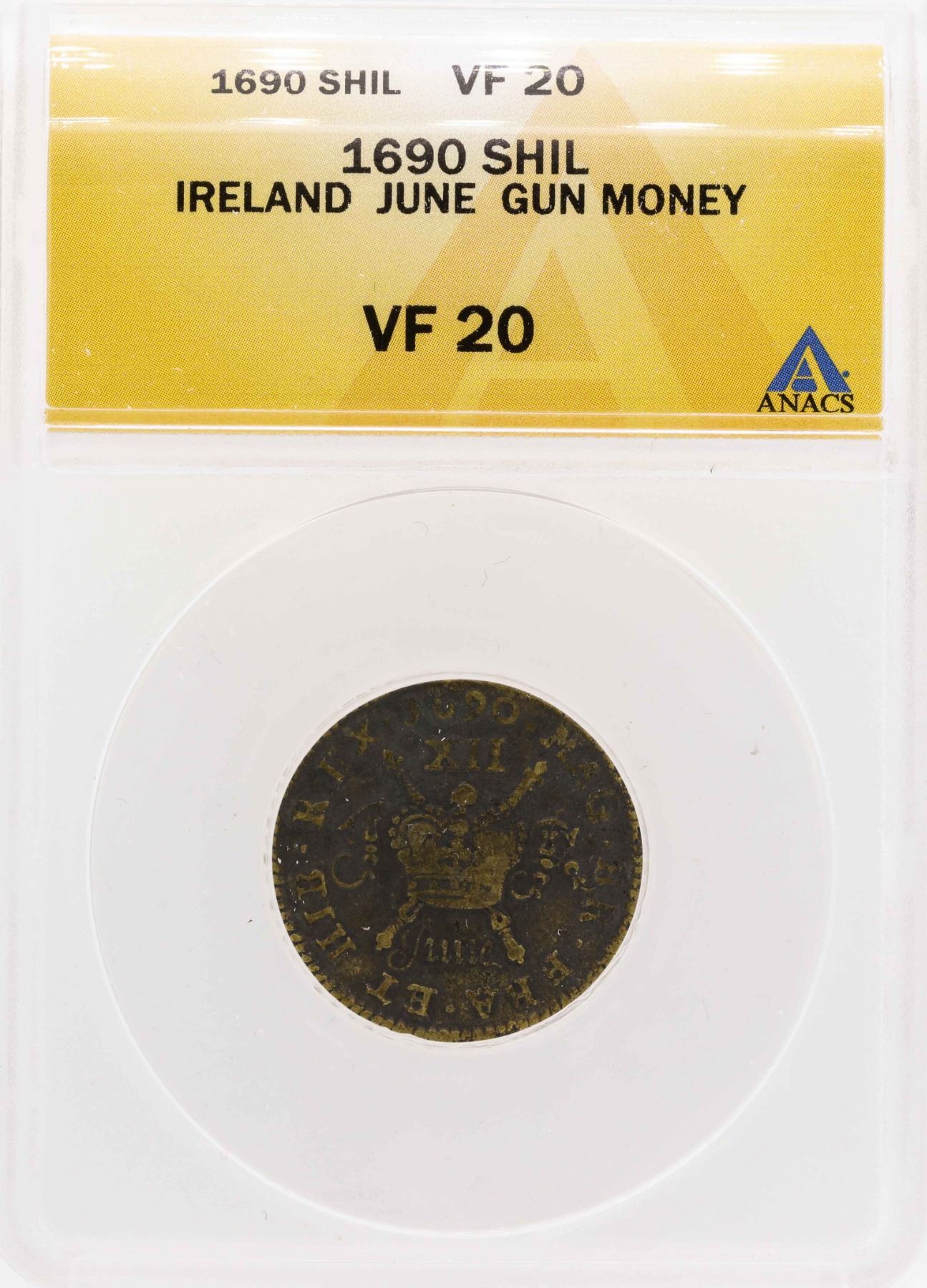 One 1690 Ireland June Gun Money Shilling Coin ANACS VF20.