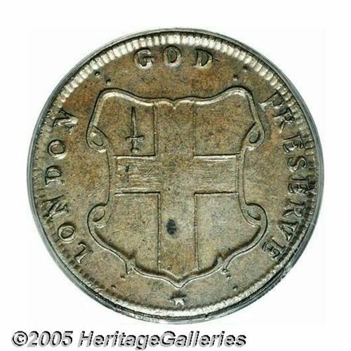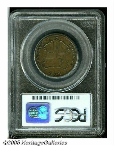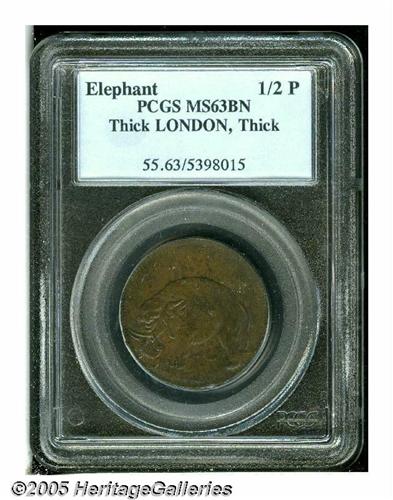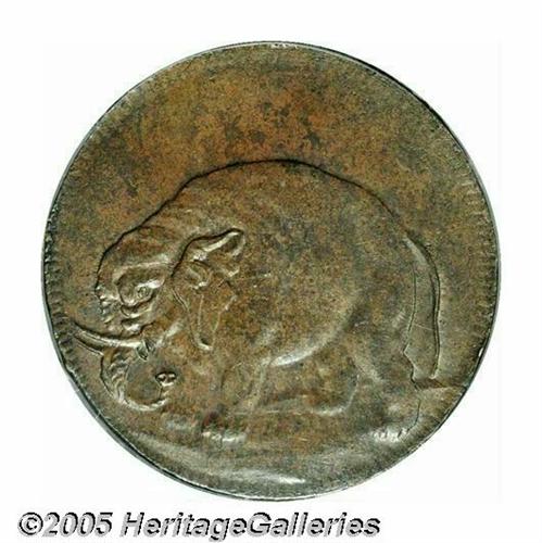 <B>(1694)<TOKEN> London Elephant Token, Thick Planchet MS63 Brown PCGS.</B></I> No Diagonals. Breen-186. An interesting an enigmatic series, these halfpence are believed to have been struck somewhere between 1672 and 1694. This is the more frequently encountered variant, and the surfaces show attractive brown coloration with a streaky, occasional overlay of darker brown. Well struck, the lower portion of the obverse shows evidence of having been struck from a worn die and there is a prominent carbon spot on the lower portion of the reverse.