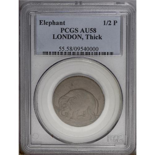 <B>(1694)<TOKEN> London Elephant Token, Thick Planchet AU58 PCGS.</B></I> Breen-186. This halfpenny is struck on a thick flan and is characterized by a six-pointed star below the arms and no diagonals. This is an unusually high grade example of this rare and popular Colonial issue. The surfaces are light reddish-brown with a tinge of darker patina over the highpoints. The surfaces are glossy and the only marks of note are a tiny pinscratch in the field above the elephant and a small planchet flake out of the center of the arms on the reverse. Listed on page 44 of the 2006 <I>Guide Book.</B></I>