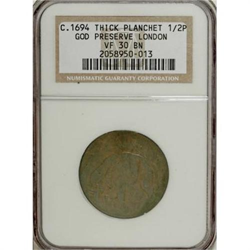 <B>(1694) TOKEN London Elephant Token, Thick Planchet VF30 NGC.</B></I> Breen-186. A nicely detailed medium brown representative. The obverse border at 4:30 is moderately granular, and the reverse has a couple of minor mint-made planchet flaws. Listed on page 44 of the 2008 <I>Guide Book.</B></I><BR><BR><b>Shipping:</b> Coins & Currency (<a target="_blank" href="http://www.heritageauctions.com/common/shipping.php">view shipping information</a>)