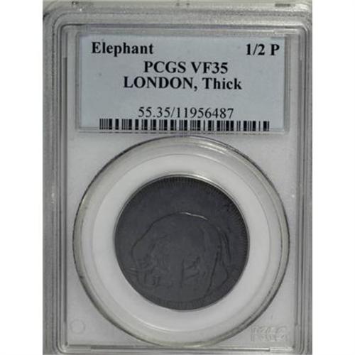 <B>(1694) TOKEN London Elephant Token, Thick Planchet VF35 PCGS.</B></I> Breen-186. A mahogany-brown representative with a nicely detailed pachyderm and uneven wear on the shield. The lower right obverse has a slender vertical planchet flaw, as made. Struck from noticeably misaligned dies, the obverse off toward 7:30, and the medal-turn reverse misaligned toward 1:30. Evidence of a double strike is limited to the obverse denticles. Listed on page 44 of the 2008 <I>Guide Book</B></I>.<BR><BR><b>Shipping:</b> Coins & Currency (<a target="_blank" href="http://www.heritageauctions.com/common/shipping.php">view shipping information</a>)