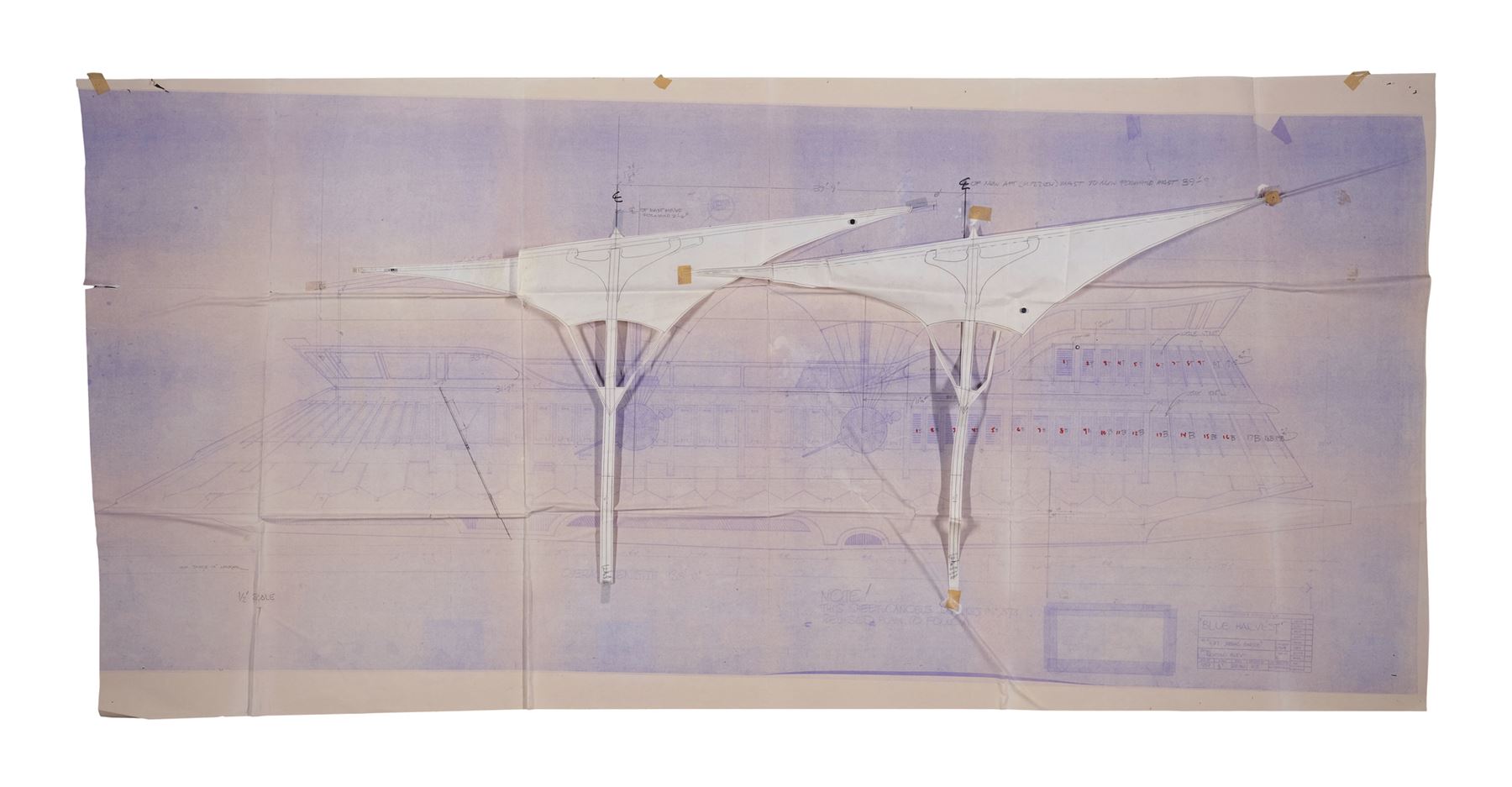 This half-scale, production-printed blueprint labeled "Ext. Jabba's Barge" and dated "27/1/82" originated from the collection of art director James Schoppe. Two mast cut-outs hand-drawn in graphite are taped to the front. The blueprint exhibits fold lines throughout and multiple tears along its edges from handling. Dimensions: 36" x 75" (91.5 cm x 190.5 cm)