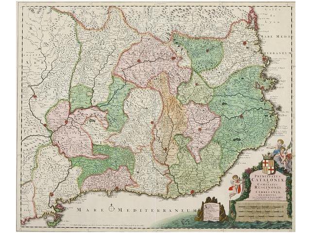 1696 CA., MAPA: (CATALUNYA),. DANCKERTS, CORNELIUM:, PRINCIPATUS CATALONIAE ET COMITATUS RISCONONIS ET CERRETANIAE DESCRIPTIO., Mapa grabado al cobre y coloreado de época, 48 x 57 cm. Bella cartela con el escudo del principado.